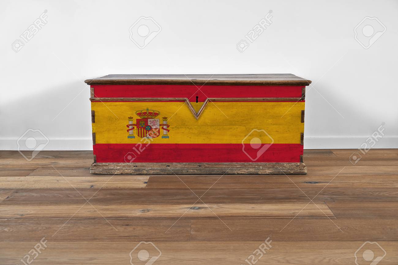 Immagini Stock - Interni Moderni Con Cassa Di Legno Vintage E Bandiera Della Pittura Spagnola Image 89987650.